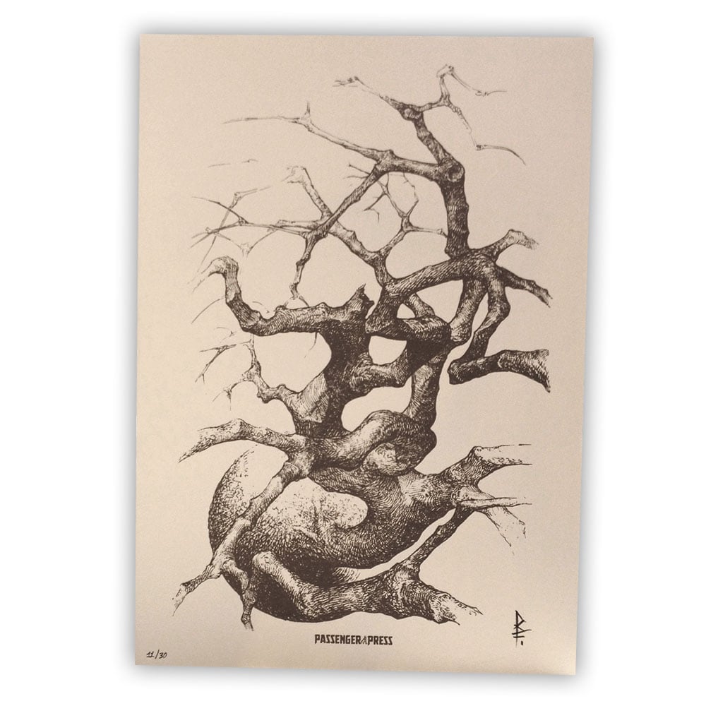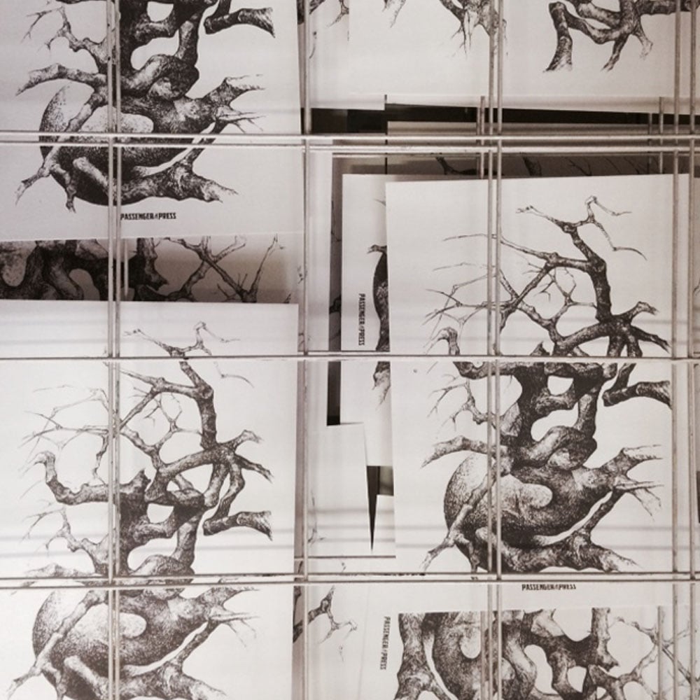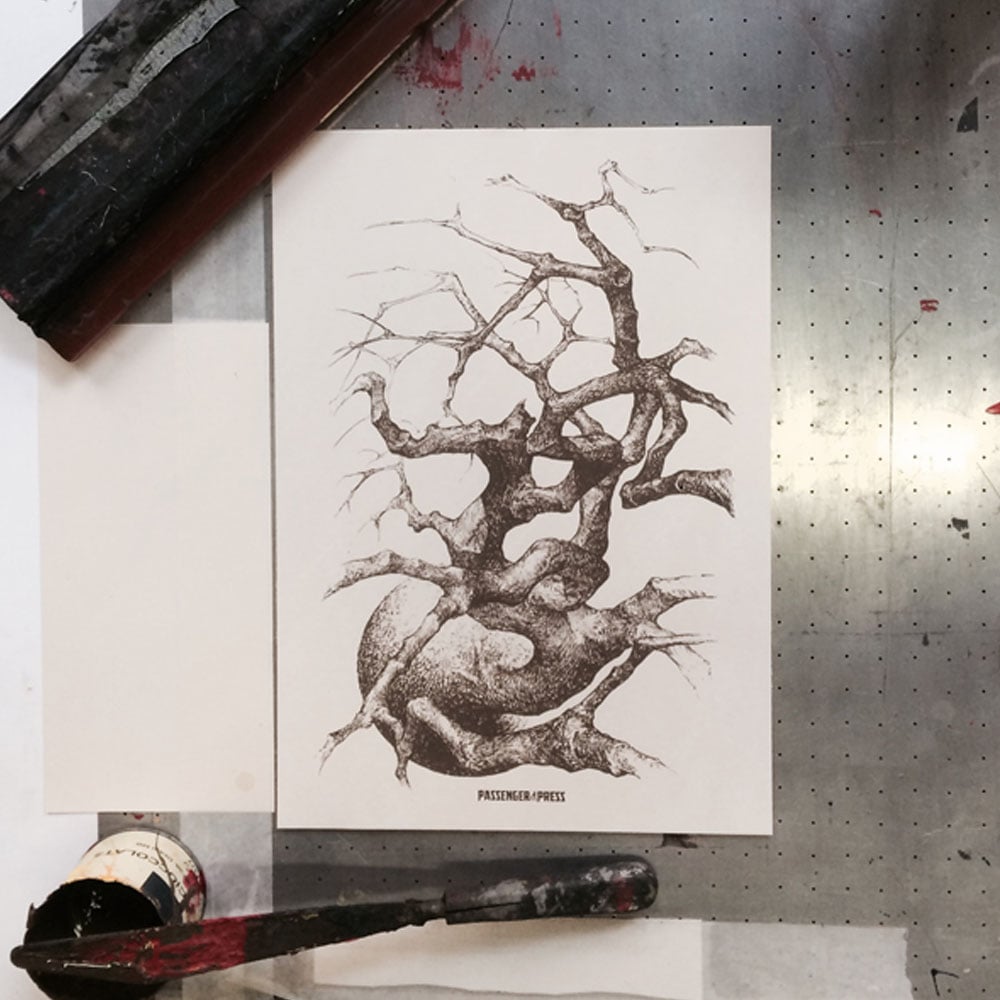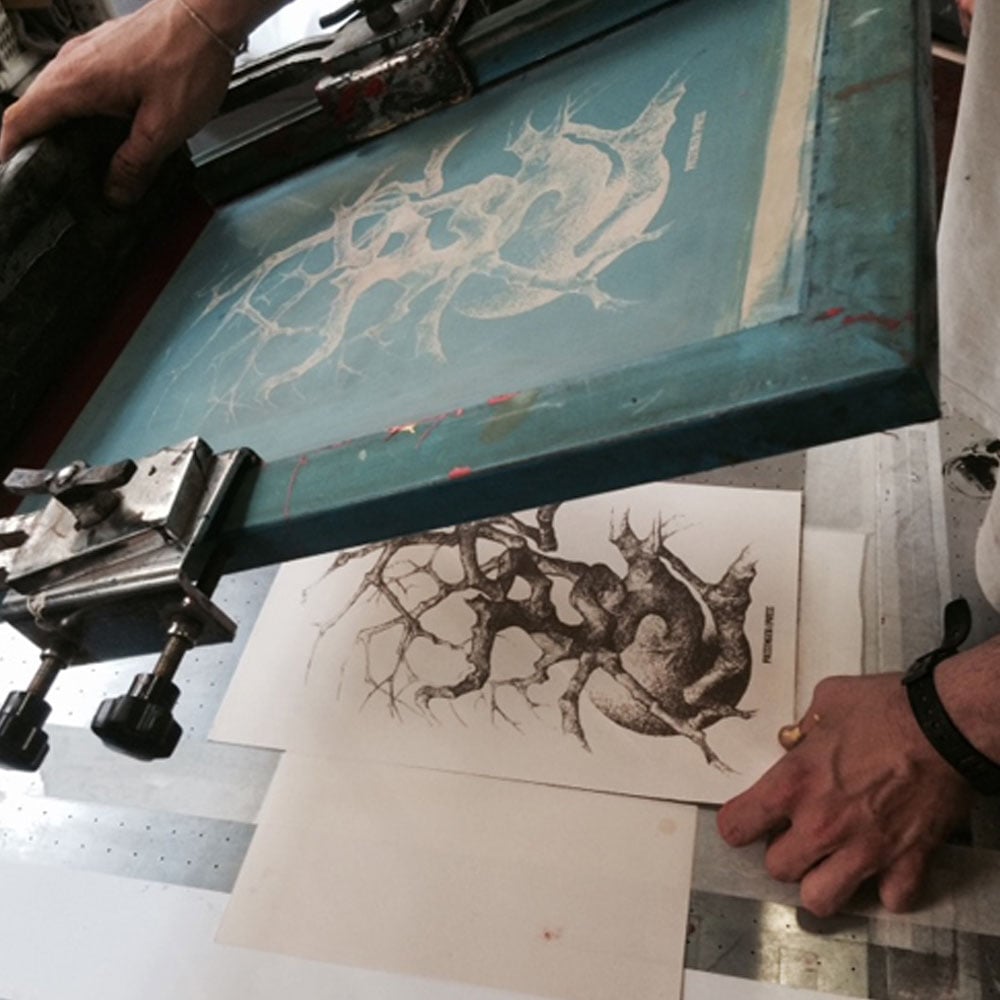 One color screen hand printing on ivory cotton paper 300 gr.